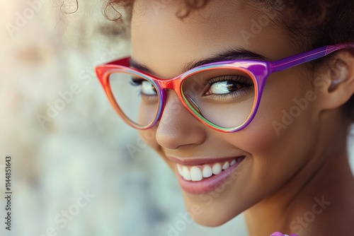 person wearing vibrant cat-eye glasses smiles under soft studio light with blurred neutral backdrop