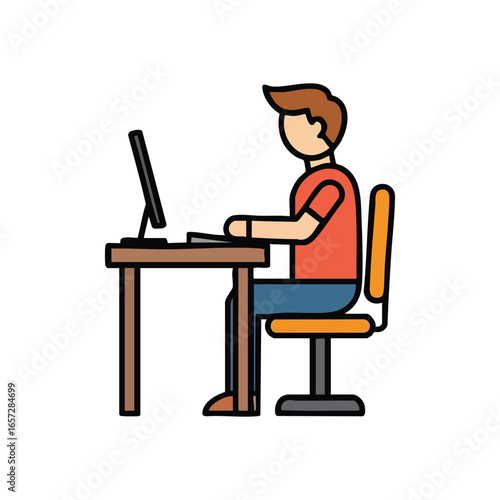 Person Working on Laptop Icon. Vibrant flat design portraying an individual intently using a notebook computer at a table. Symbolizes modern learning, remote jobs, and online connection.