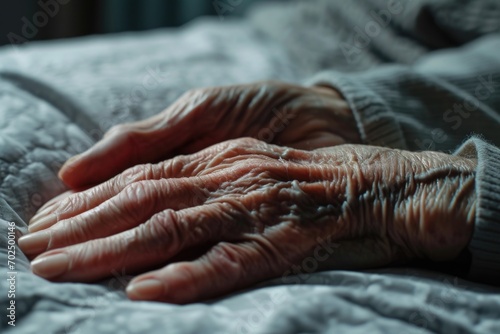 Person's hands photographed in a close up shot on a bed. Suitable for various uses