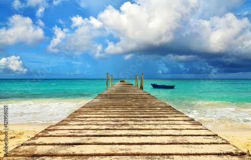 Perspective view of a wooden pier on the seashore with clear blue sea. Fishing boat at the sea coast of the Dominican Republic. Blue fishing boat.
