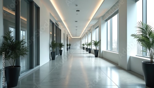 Perspective view of bright office corridor with potted plants, windows. Modern interior with glossy floor, lamps on ceiling. Empty hall in business building, co-working or shopping center.