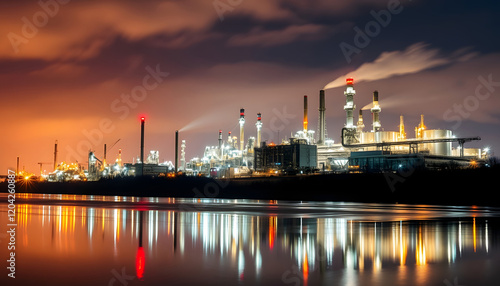 petrochemical plant in night time with reflection over the river, dramatic atmosphere, with white tones