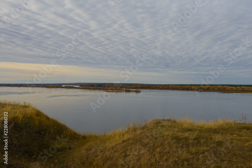 Пейзаж с рекой. Вид с высокого берега. Осенний вечер.