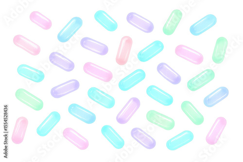 Pharmaceutical pills cascading dynamically, highlighting medical treatment diversity through vibrant color palette against clean transparent surface
