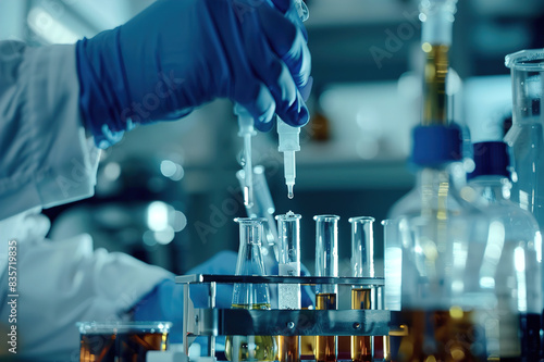 Pharmacist dispensing medication, measuring precise doses of essential chemical compounds.
