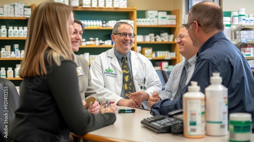 Pharmacy staff engage in a collaborative discussion about patient needs and medications