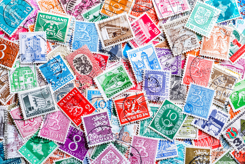 Philately.Postage stamps.Collection of stamps and magnifying glass.A collection of world stamps in a pile.Postage stamps from different countries and times