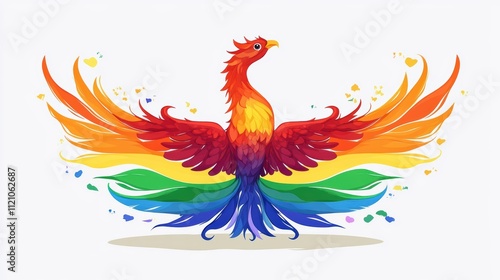 Phoenix Rising in Rainbow-Colored Flames Fantasy Realm Digital Artwork Vibrant Environment Dynamic Viewpoint Symbol of Transformation