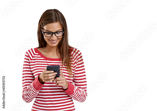 Phone, typing and happy woman or student on social media, university email or chat isolated on transparent png background. Mobile, contact and person search college website or scholarship information