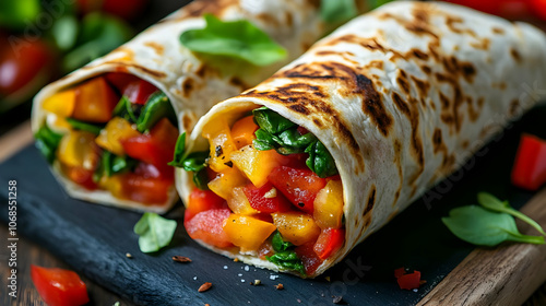 Photo Grilled Vegetable Wraps with Spinach, Red, and Yellow Bell Peppers