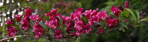 Photo horizontale de Weigela, dimension slider ou bannière, avec de jolies fleurs rose foncé, pour un univers délicat, végétal et féminin.