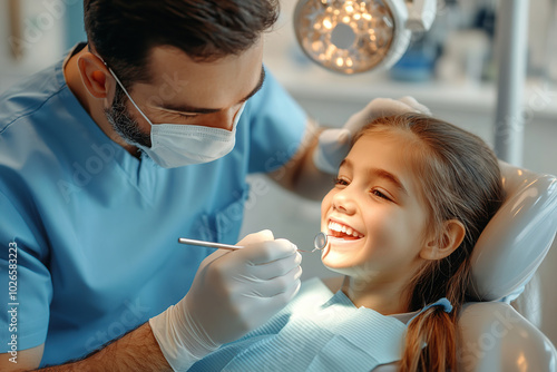 Photo of a child girl sitting in a dental chair and male dentist treating her teeth