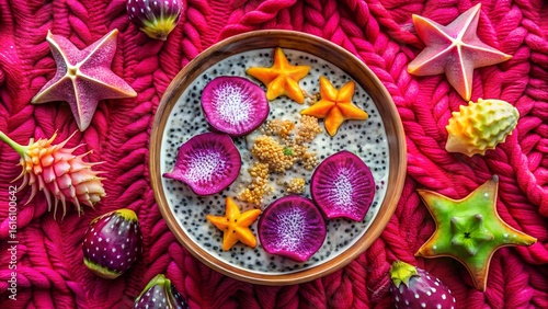 Photo of a colorful smoothie bowl adorned with dragon fruit slices, star fruit, and prickly pears on a vibrant pink textured background