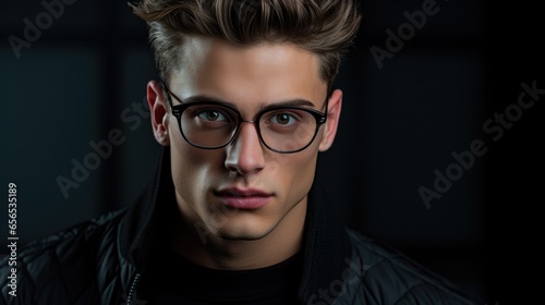 Photo of a handsome man in a business suit and stylish glasses.