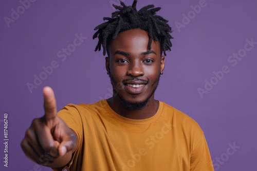 Photo of a happy black man wearing a casual t-shirt pointing his index finger at the camera on a purple studio background
