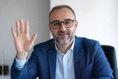 Photo of a happy man in a blue blazer and glasses, sitting at a desk with a white wall behind him, waving his hand to the camera for an online video call or greeting people during a remote work meetin