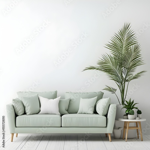 Photo of a minimalist living room with a green sofa and indoor plant