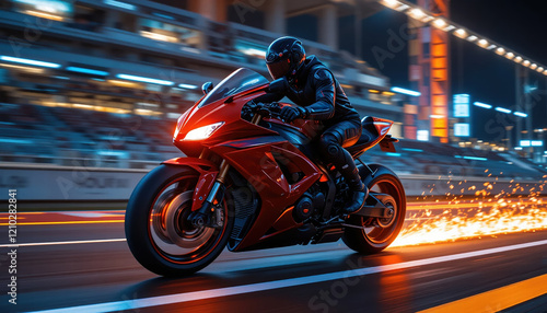 Photo of a racer on his sports motorbike, speeding along at high speed