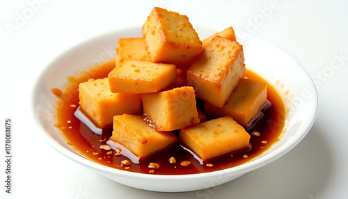 Photo of a serving of Tahu Gejrot, featuring crispy tofu cubes drenched in sweet and spicy soy sauce, on a white background