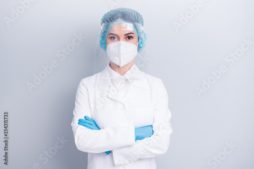 Photo of attractive confident virologist doctor lady arms crossed serious reliable professional wear medical coat mask facial plastic protection shield surgical cap isolated grey background