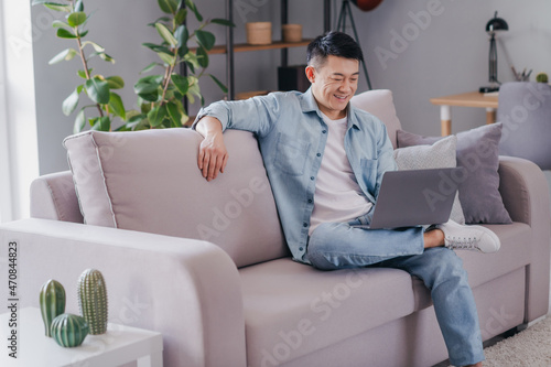 Photo of confident relaxed chinese man sit couch enjoy netbook movie weekend wear casual shirt in home indoors