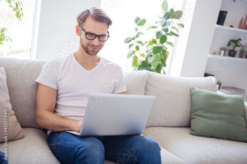 Photo of handsome charming gentleman wear casual outfit sitting sofa working modern device indoors apartment house