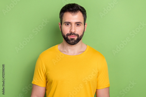 Photo of nice positive young person calm face look camera isolated on green color background
