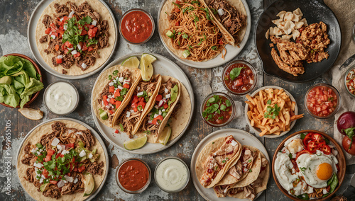 Photo of overhead shot showcasing a variety of delicious tacos and toppings arranged on a rustic table ready to be served