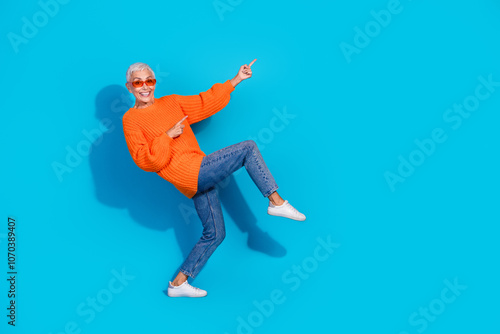 Photo of positive old lady moving carefree point finger empty space place for ads isolated blue color background