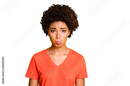 Photo of sullen dark skin lady offended after boyfriend rude behavior wear orange v neck t-shirt isolated yellow color background