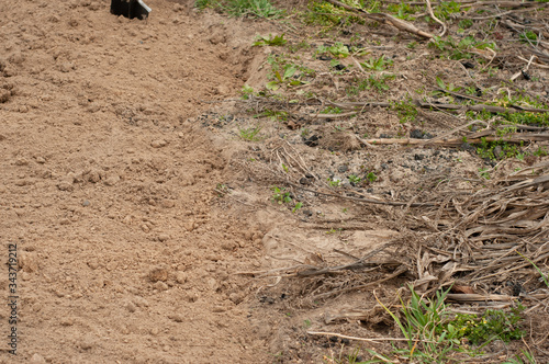 Photo of the garden before and after its processing. Cleaning the soil from weeds and plowing the land.