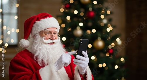Photo Santa Claus Using Smartphone in Festive Christmas Time Indoors