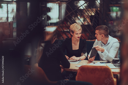Photo through the glass of a group of business people sitting in a cafe and discussing business plans and ideas for new online commercial services