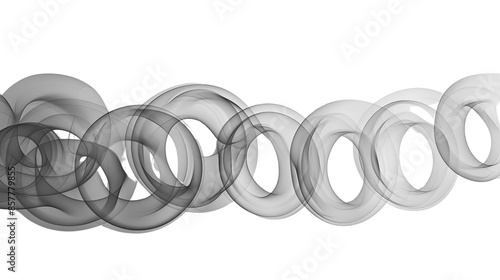 Photograph of a series of smoke rings, perfectly formed and evenly spaced, floating against a transparent background.