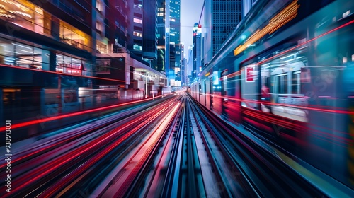 photograph of an electric train moving rapidly through the city, with buildings on both sides