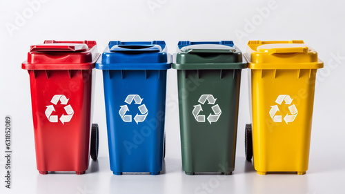 photograph of Yellow, Green, Blue and Red recycle bins with recycle symbol isolated on white background.generative ai