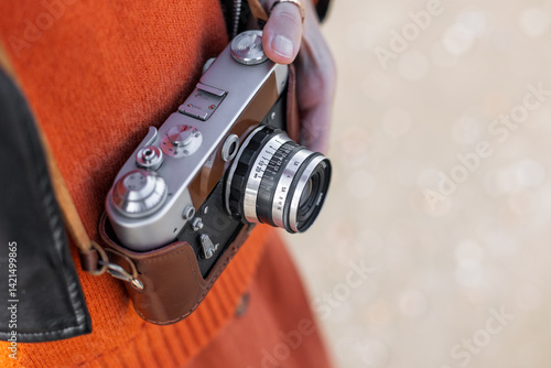 photographer adjusts camera. girl travels and takes pictures of sights. stylish girl with film camera.