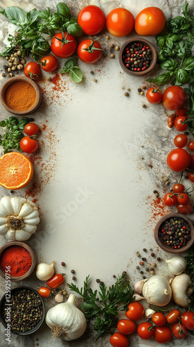 Photography of spice, herbs and ingredients, creating an empty space in the center for text or design elements.