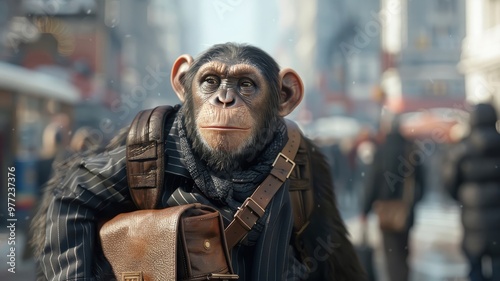 Photorealistic chimpanzee in pinstripe suit walking through city.