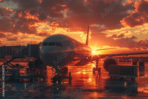 Photorealistic depiction of cargo being loaded onto an airplane at the airport, with the sun setting in the background