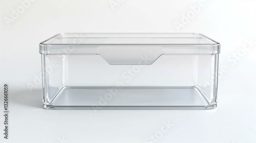 Photorealistic image of a clear acrylic kitchen storage bin with handles, isolated on a white background