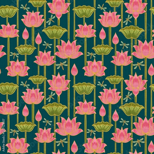 Pichwai-inspired seamless lotus pattern with pink blooms, green lotus pods, buds, and delicate dragonflies on a deep teal backdrop. Ideal for wallpaper, textiles, home decor, and modern Indian design
