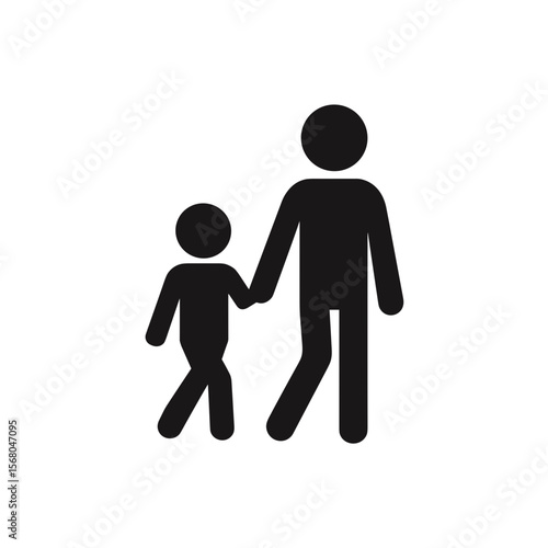 Pictogram representing an adult holding hands with a child while walking. Simple black figures against a white background, symbol.