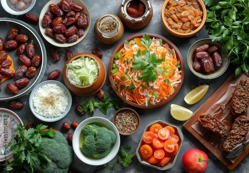 Picture of a traditional iftar meal spread on a table with dates, fruits, and various dishes