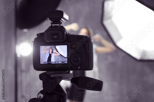 Picture of young beautiful model on camera display while shooting
