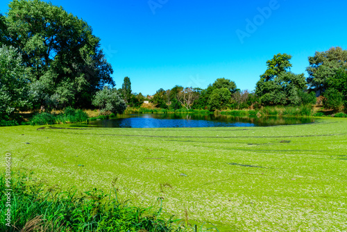 Picturesque eutrophic pond covered with green Duckweed and Wolfia algae, surrounded by lush plants and an old building that evokes tranquility.