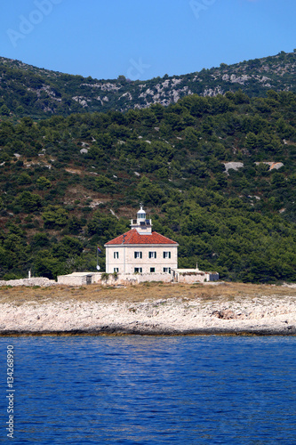 Picturesque lighthouse on a small island in the Adriatic Sea. Near town Hvar, island Hvar, Croatia.