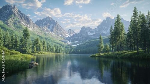 Picturesque Mountain Lake with Reflections of Majestic Peaks and Lush Forest.