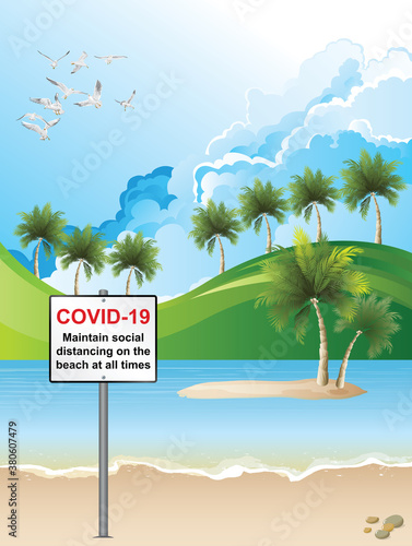 Picturesque tropical beach scene with COVID 19 social distancing information sign set against a blue cloudy daytime sky