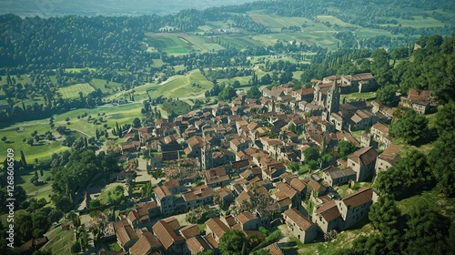 Picturesque Village Aerial View Rolling Hills Lush Green Landscape Tranquil Rural Scene